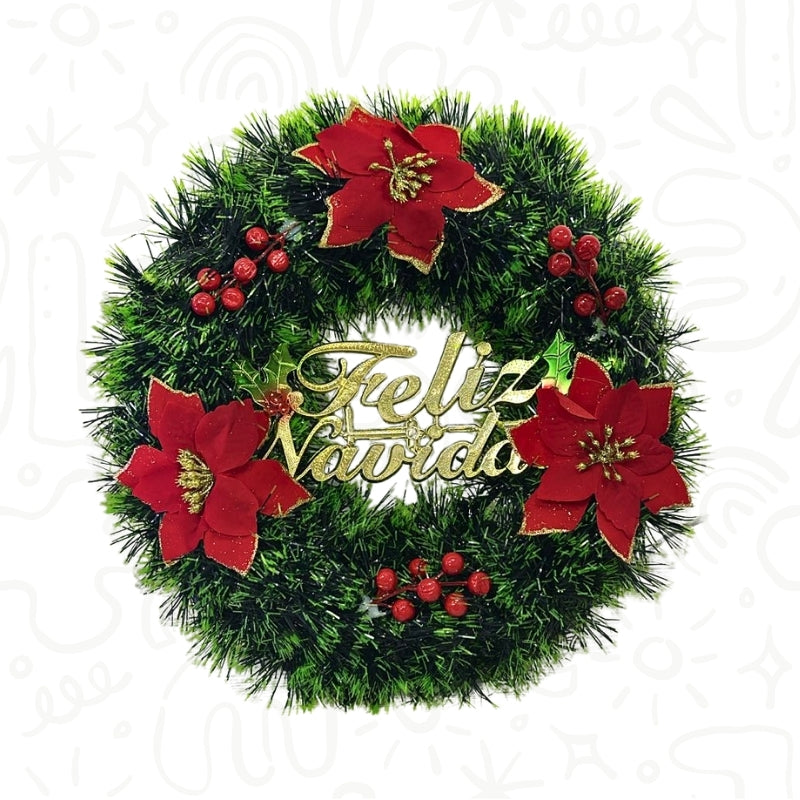 Llena tu hogar de alegría y color con esta hermosa corona navideña con flores rojas y letrero “Feliz Navidad” 🎄✨. Decorada con hojas verdes, flores de pascua con detalles dorados y esferas rojas, es perfecta para colocar en puertas, paredes o ventanas y dar la bienvenida a la temporada más especial del año. Fabricada con materiales resistentes y duraderos, aporta un toque cálido, elegante y festivo a cualquier espacio. 🎅🌟❤️