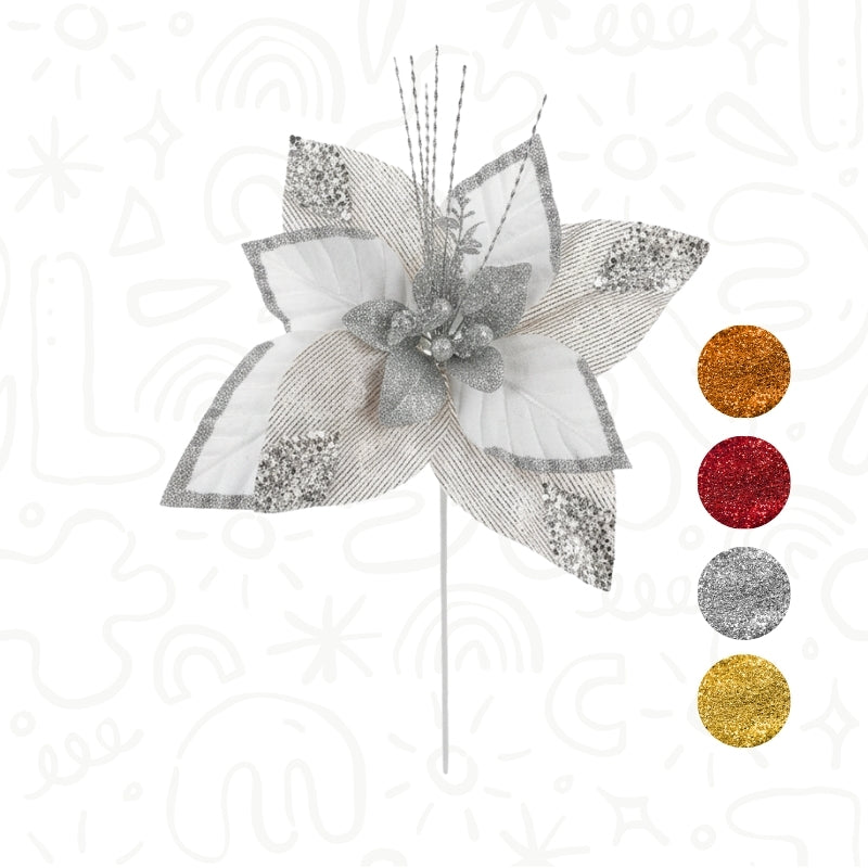 Decora tu árbol, coronas o arreglos con esta flor navideña con espiga, una pieza elegante y versátil que combina texturas metálicas y destellos de escarcha. Aporta un toque de brillo y sofisticación a cualquier ambiente festivo. 🎄💫